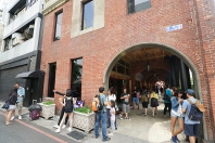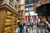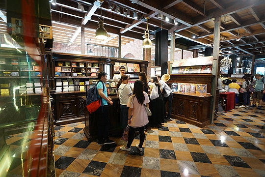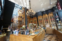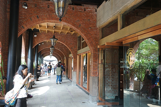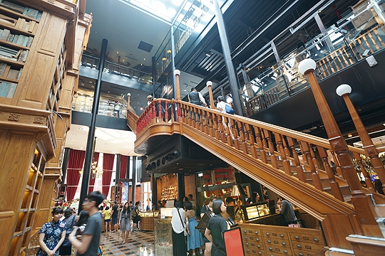 「日出」是臺中以土鳳梨酥一戰成名的店家其買下了宮原眼科的舊址並完整保留其外部的紅磚牆、舊牌樓,打造出懷舊的紅磚木頂式騎樓,仿造復古挑高圖書館的裝飾充滿魔幻感,中央那座古井被重新打造成現代風的圓型玻璃募款箱,其巧思令人讚嘆。