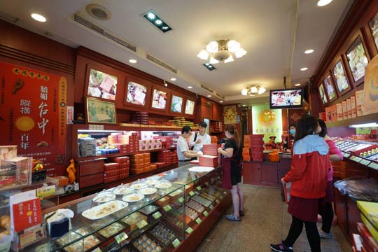 牆上掛滿產品照與風趣的形象海報,店內外皆有人員服務試吃,小編從外到內吃完一輪後還是選擇台中名產太陽餅其外皮酥香,麥芽糖製成的內餡甜度適中,挺好吃der!!