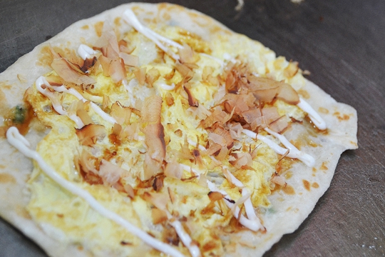 熱騰騰的送入口裡,酥酥的外皮又香又脆。蒜味+胡椒的就是傳統蛋餅口味,經典不敗!另外日式醬料真的很特別!裡面有美乃滋跟柴魚,真的第一次吃到!!而且甜甜鹹鹹的日式風味,吃起來不膩口,加上起司又是更香濃~