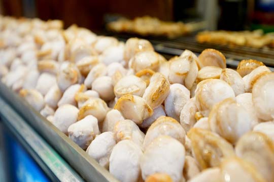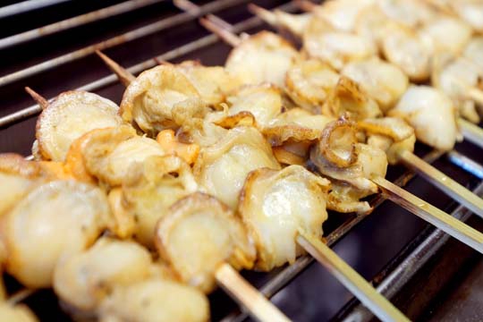 被稱為上品海味的干貝,不僅有迷人的彈牙口感,還具有高營養價值!一顆顆新鮮肥美的干貝被串成一串串放到炙熱的烤架上,老闆以熟捻的功夫不時的翻動每一顆干貝並均勻地刷上醬料,經慢火細烤後的干貝會微微縮小,但口感依舊軟嫩鮮美,一絲一絲的干貝肉,細緻彈牙,每一口都吃得到大海的鮮甜味!口味選擇眾多,銅板價就能在夜市裡能品嘗到海之美味!